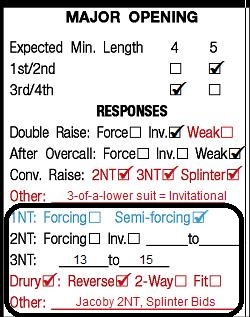 Jacoby 2NT is used as marked in Red (also the 2NT box is checked--as discussed last month). Assume Standard Conventional GF 2NT response to 1M to show 4+ card support Jacoby 2NT unless your partnership wishes to take on extra memory. Jacoby 2NT is not used by a passed hand or over any interference. For an advanced system of Jacoby 2NT, click here.